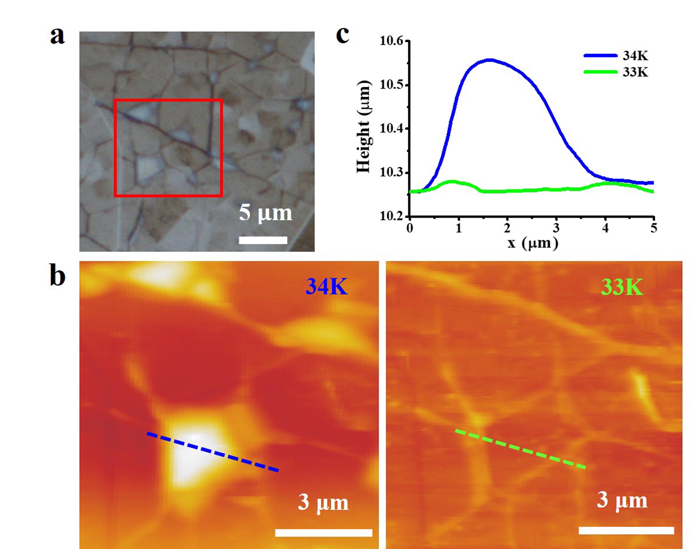 圖2. a: 六方氮化硼光學(xué)顯微鏡照片;b: 六方氮化硼34K與33K溫度下的低溫原子力顯微鏡形貌圖,當(dāng)溫度34K時存在氣泡(圖中亮色部分);c: 六方氮化硼氣泡不同溫度下的高度,當(dāng)溫度33K時氣泡消失